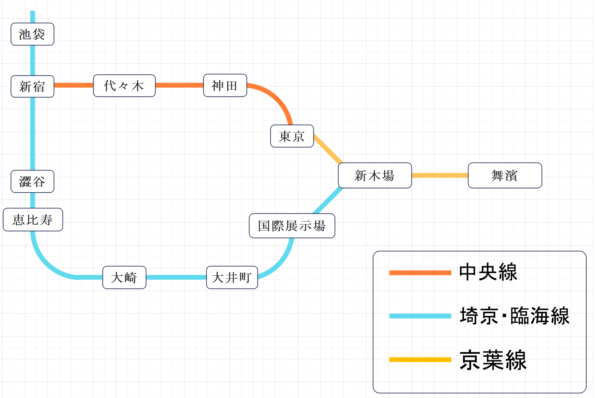 順帶一提,埼京線與臨海線其實是兩條線路,但由於它們實現了相互乘換,也就是說兩條線路互通,埼京線的列車也會在臨海線上行駛,所以這裡就把它們看成同一條線路了。