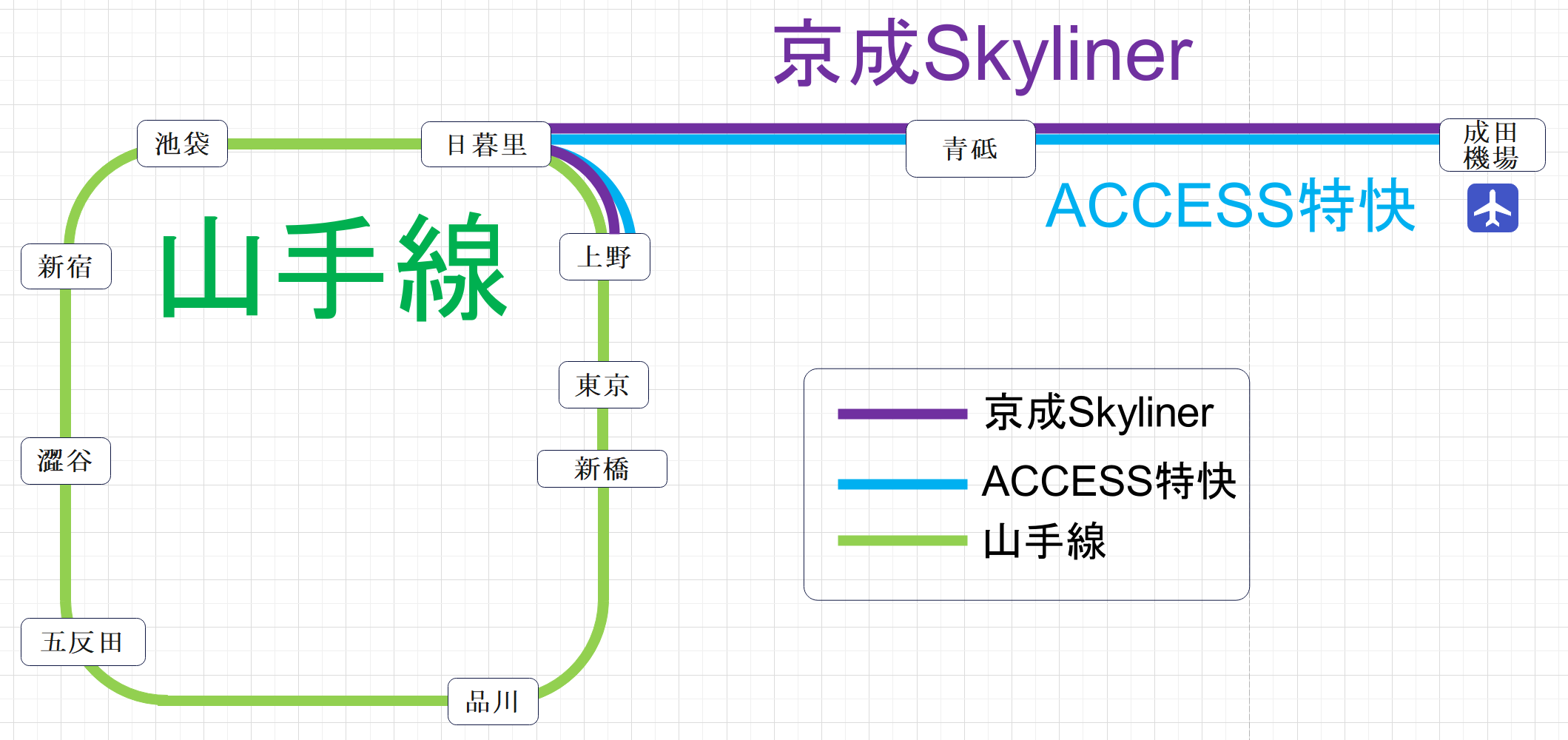 所需時間約為1小時20分鐘,性價比最高。如果要從成田機場前往秋葉原區域,這種方法是最標準的。從成田機場站可以乘坐特急京成Skyliner,直接到達上野區域。京成Skyliner與在來線組合的基本路線是: 「成田機場」站→(京成Skyliner)→「日暮里」站→京浜東北線「日暮里」站→「秋葉原」站。